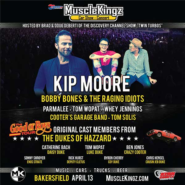 County Raceway with performances by platinum-selling hitmaker KIP MOORE, Dancing with the Stars winner and award-winning radio personality BOBBY BONES & THE RAGING IDIOTS, chart-topping country group PARMALEE, The Dukes of Hazzard cast member TOM WOPAT, the grandson of Waylon Jennings WHEY JENNINGS, COOTER’S GARAGE BAND, TOM SOLIS and more. Tickets and all info available at www.MuscleKingz.com.
